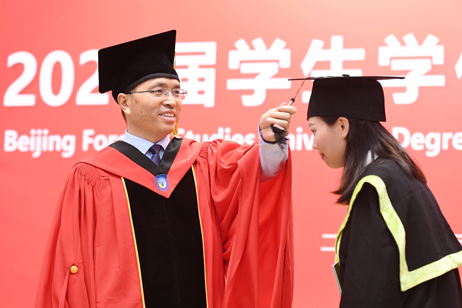 贾文键宣读了《北京外国语大学关于授予2021届学士、硕士、博士学位的决定》。2021届毕业生中,共有61名学生获授博士学位,1064名学生获授硕士学位,2197名学生获授学士学位。全体校领导为毕业生代表授予学位。
