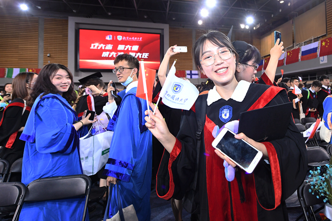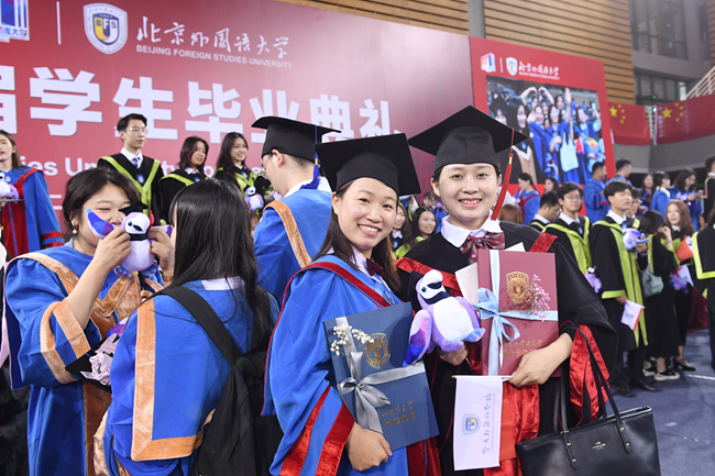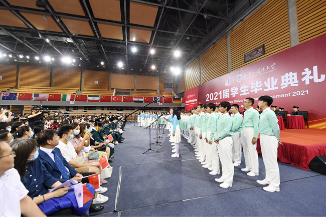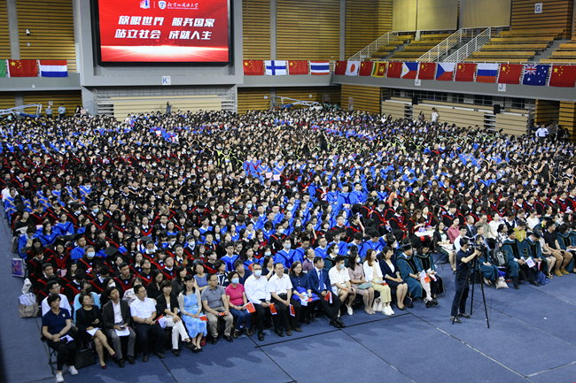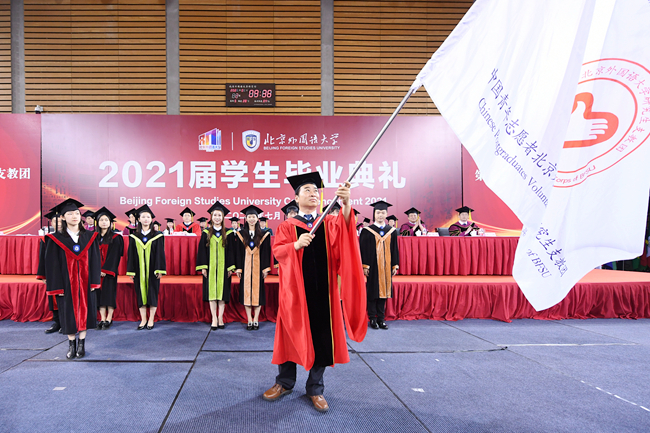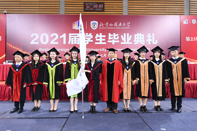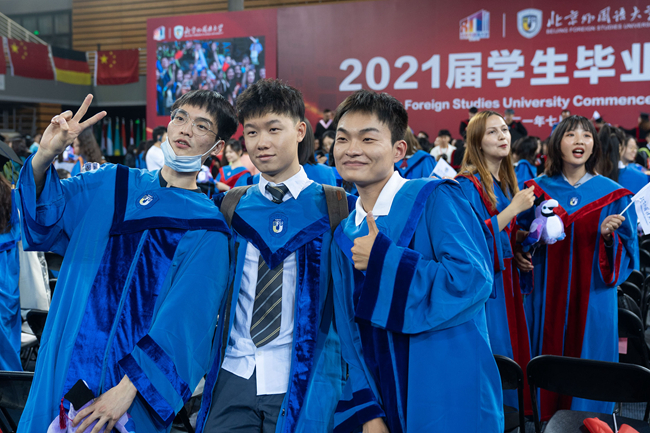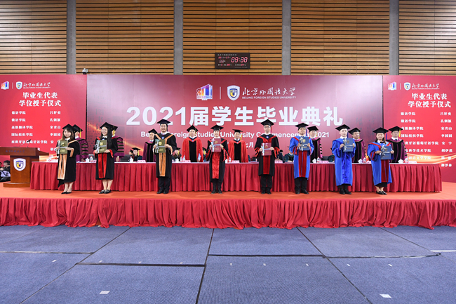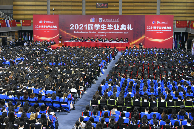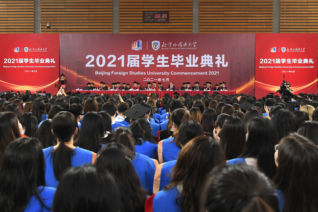 在热烈庆祝中国共产党成立100周年的浓厚氛围中,7月2日,北京外国语大学2021届学生毕业典礼在体育馆隆重举行。