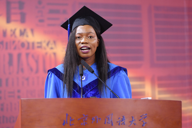 国际关系学院津巴布韦留学生马文莉代表留学生发言,她感谢北外的培养和老师同学的帮助,赞叹中国政府在全球抗击疫情中的积极贡献。她提到,最近通过学习习近平总书记给北京大学留学生们的回信精神,感到备受鼓舞,未来将会发挥自身所学,把真实的中国介绍给更多身边的人。