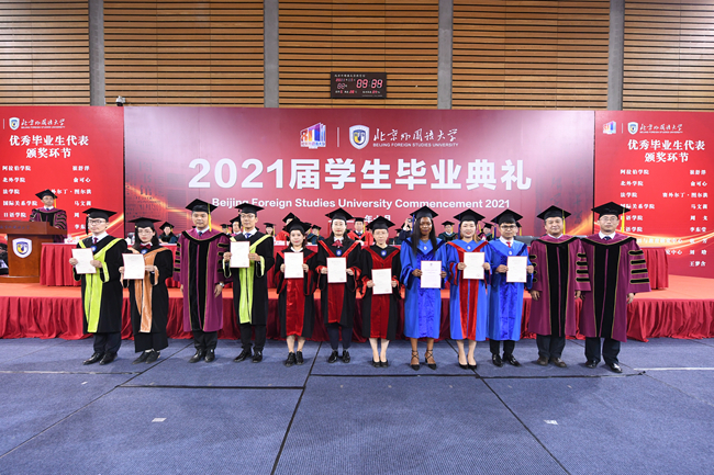 孙有中宣读了《北京外国语大学关于表彰2021届优秀毕业生的决定》。今年,北外共有123名同学荣获“北京市优秀毕业生”荣誉称号,260名同学荣获“北京外国语大学优秀毕业生”荣誉称号。胡志钢、丁浩、赵刚为获得“优秀毕业生”荣誉称号的毕业生代表颁发了证书。