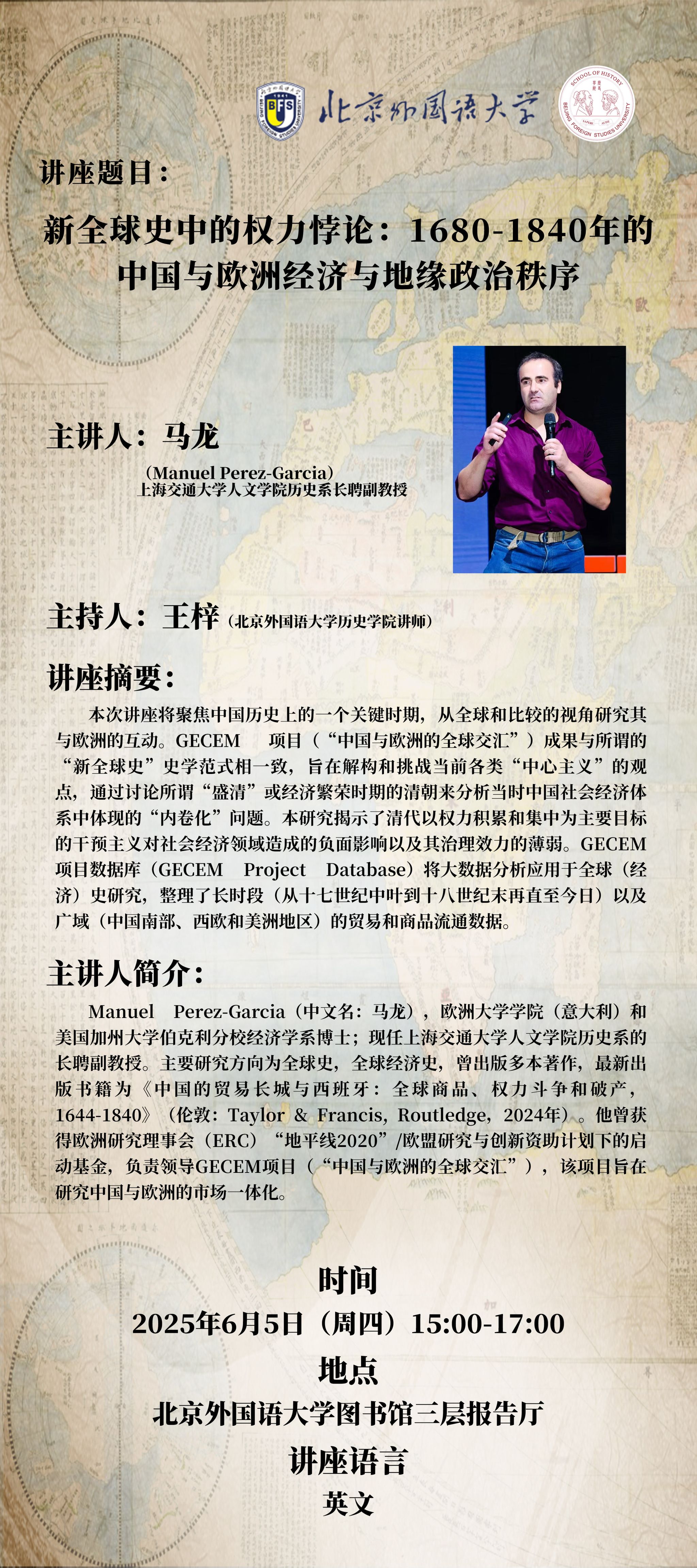 本次讲座将聚焦中国历史上的一个关键时期,从全球和比较的视角研究其与欧洲的互动。GECEM 项目(“中国与欧洲的全球交汇”)成果与所谓的“新全球史”史学范式相一致,旨在解构和挑战当前各类“中心主义”的观点,通过讨论所谓“盛清”或经济繁荣时期的清朝来分析当时中国社会经济体系中体现的“内卷化”问题。本研究揭示了清代以权力积累和集中为主要目标的干预主义对社会经济领域造成的负面影响以及其治理效力的薄弱。GECEM 项目数据库(GECEM Project Database)将大数据分析应用于全球(经济)史研究,整理了长时段(从十七世纪中叶到十八世纪末再直至今日)以及广域(中国南部、西欧和美洲地区)的贸易和商品流通数据。