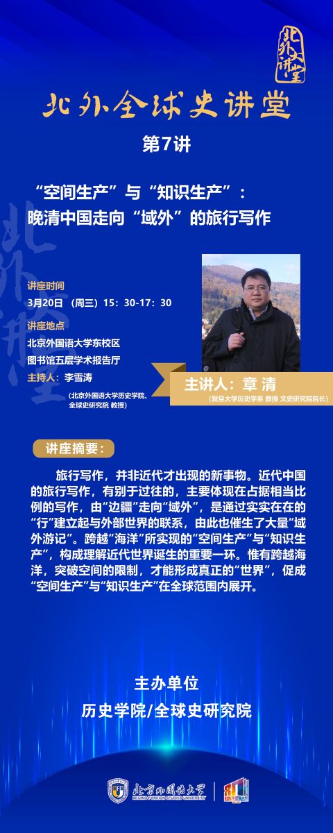 2024年3月20日 在北外图书馆学术报告厅成功举办了《“空间生产”与“知识生产”:晚清中国走向“域外”的旅行写作》的讲座。亚洲精品国产大片www院长李雪涛教授主持了这场讲座, 首先简单介绍了复旦大学历史学系、文史研究院院长章清教授研究领域及成果,然后大家倾听了章清教授精彩的报告, 最后的互动环节,与会者积极参与讨论,章清教授给予北外的学子们掌握好外语在今后的历史研究领域发挥更大的作用。